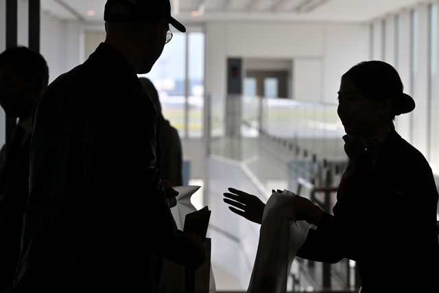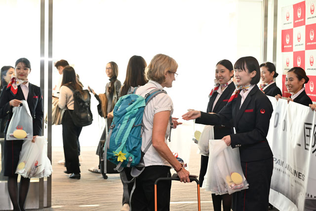 JALのA350-1000ロンドン線初便となった羽田発JL43便の乗客に記念品を手渡すJALのグランドスタッフ=24年10月24日 PHOTO: Tadayuki YOSHIKAWA/Aviation Wire