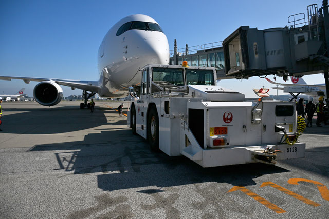 JALのスタッフに見送られて羽田を出発するA350-1000 初の欧州路線ロンドン行きJL43便=24年10月24日 PHOTO: Tadayuki YOSHIKAWA/Aviation Wire