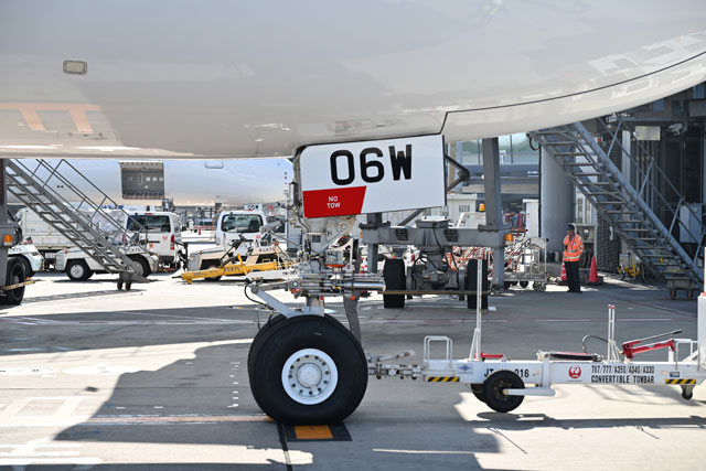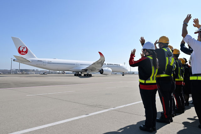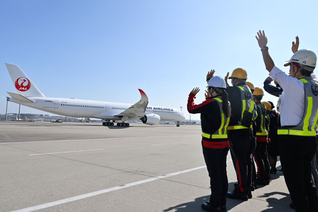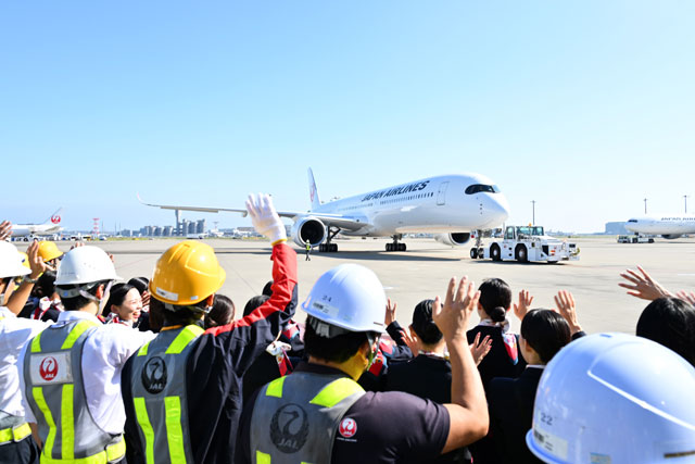 羽田空港を出発するJALのA350-1000ロンドン線初便JL43便を見送るJALのスタッフ=24年10月24日 PHOTO: Tadayuki YOSHIKAWA/Aviation Wire