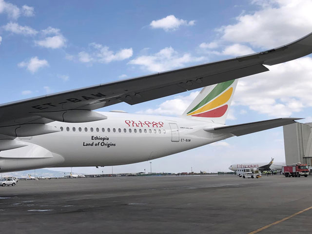 アディスアベバに到着したエチオピア航空のエアバスA350-1000(同社提供)