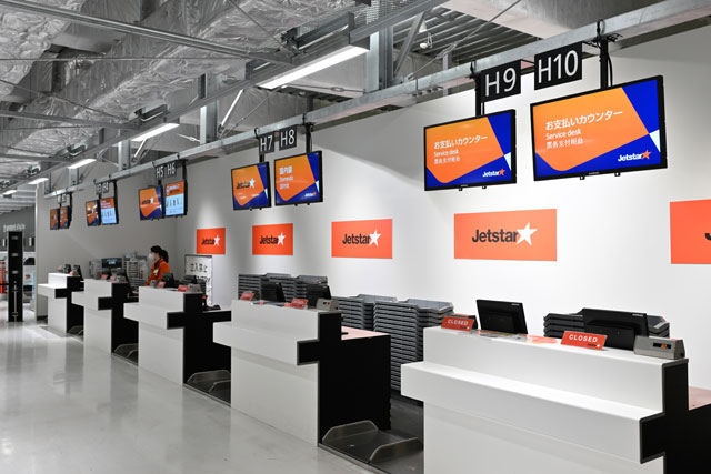 新デザインの案内表示に変わった成田空港のジェットスター・ジャパンのカウンター=24年11月28日 PHOTO: Tadayuki YOSHIKAWA/Aviation Wire
