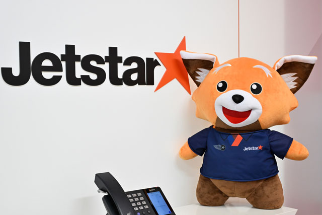 成田空港のオフィス受付で出迎える新制服を着用したジェットスター・ジャパンのマスコット「ジェッ太」=24年11月28日 PHOTO: Tadayuki YOSHIKAWA/Aviation Wire