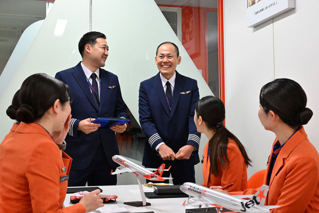 成田空港でブリーフィングするジェットスター・ジャパンの新制服初便となった成田発関西行きGK217便のパイロットと客室乗務員=24年11月28日 PHOTO: Tadayuki YOSHIKAWA/Aviation Wire