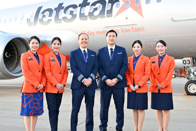 ジェットスター・ジャパンの新制服初便となった成田発関西行きGK217便のパイロットと客室乗務員=24年11月28日 PHOTO: Tadayuki YOSHIKAWA/Aviation Wire