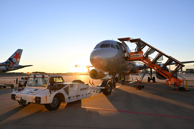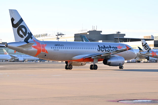 成田空港で出発を待つジェットスター・ジャパンの新制服初便となった関西行きGK217便=24年11月28日 PHOTO: Tadayuki YOSHIKAWA/Aviation Wire