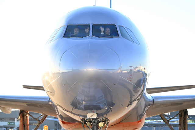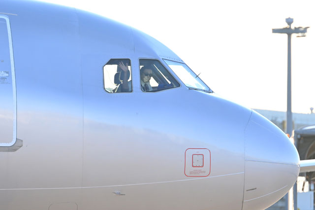 ジェットスター・ジャパンの新制服初便となった成田発関西行きGK217便のコックピットから手を振る機長=24年11月28日 PHOTO: Tadayuki YOSHIKAWA/Aviation Wire
