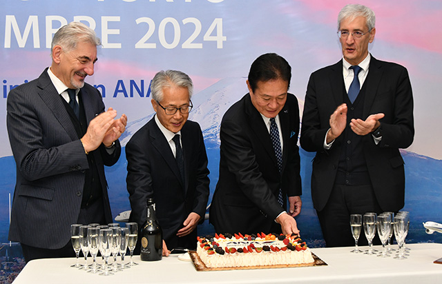 ミラノ・マルペンサ空港での記念式典でケーキカットするANAの井上社長(右から2人目)=24年12月3日 PHOTO: Yusuke KOHASE/Aviation Wire