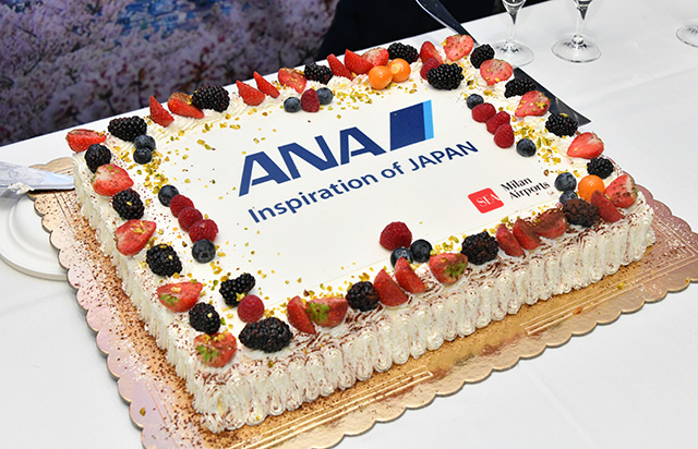 ミラノ・マルペンサ空港での記念式典で用意されたANAロゴ入りのケーキ=24年12月3日 PHOTO: Yusuke KOHASE/Aviation Wire