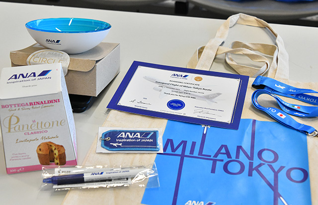 ANAのミラノ発初便のNH208便への乗客に渡した記念品=24年12月3日 PHOTO: Yusuke KOHASE/Aviation Wire