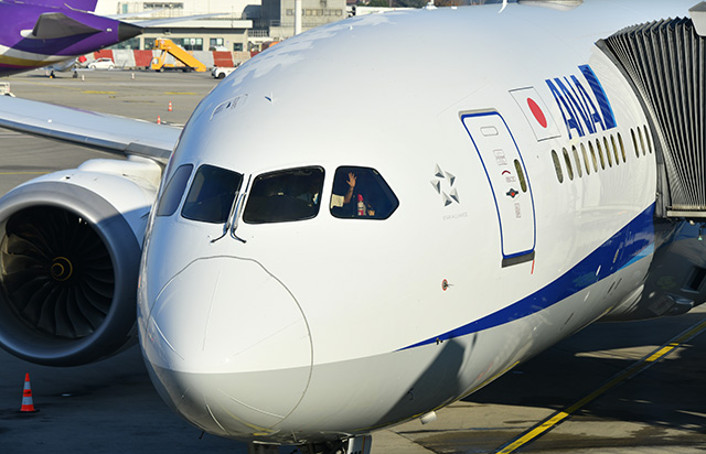 コックピットから手を振るANAのミラノ発初便のNH208便のパイロット=24年12月3日 PHOTO: Yusuke KOHASE/Aviation Wire