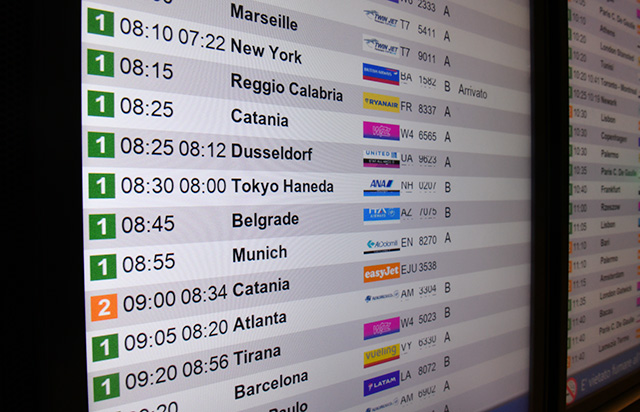 ANAの到着初便となるNH207便を示すミラノ・マルペンサ空港の到着案内モニター=24年12月3日 PHOTO: Yusuke KOHASE/Aviation Wire