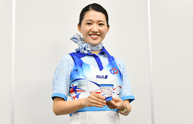 乗客には四角いステッカーをプレゼントするほか、客室乗務員(CA)が特別デザインのエプロンを着用する。紙コップもオリジナルデザインで、プレミアムクラスでは濃い青の「トリトンブルー」、普通席では薄い青の「モヒカンブルー」をベースとしたデザインを採用する。このほかANAグループのCAと地上係員は、万博の公式キャラクター「ミャクミャク」をデザインしたピンバッジを着用。国内・海外空港の係員を含め約1万8000人が身に着け、万博を幅広くアピールする。