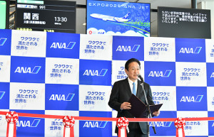初便となったNH991便が出発した、羽田空港第2ターミナル61番搭乗口(スポット)付近で記念式典を開催し、ANAの井上慎一社長らが出席。井上社長は、1970年に開催された前回の大阪万博を訪れたときにエピソードを披露した。当時小学6年生だった井上少年は、前回の万博で海外の人々と初めて会い、世界には多くの民族があることを目の当たりにしたという。井上社長は今回の万博を契機に「かつての私のように、未来を担う若者が世界への興味と未来への希望を抱くきっかけになれば、と期待している」と語った。