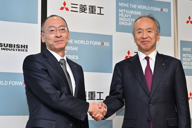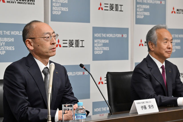 三菱重工の新社長に就任する伊藤栄作常務(左)と会長に就く泉澤清次社長=24年12月18日 PHOTO: Tadayuki YOSHIKAWA/Aviation Wire