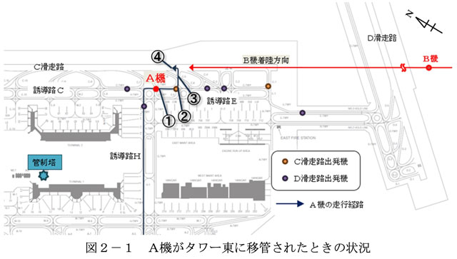 一方、海保機がC滑走路の離着陸機を担当する東京飛行場管制所の「タワー東」の無線周波数に切り替える前に、JL516便に着陸許可が出ていたことから海保機はC滑走路へ進入中のJL516便を認識していなかった。また、タワー東の管制官から海保機に対し、離陸順序が1番目であることを意味する「No.1」の指示があった際、海保機の機長は管制官が離陸順位を優先してくれたと認識していた。また、副操縦員が管制指示を「To holding point C5, JA722A, No.1 Thank you」と復唱した際、機長は「No.1」と誘導路を示す「C5」のみ復唱確認していた。