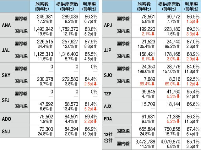 12社の発表値を合計すると、旅客数は国際線が前年同期比24.8%増の65万5884人、国内線は11.3%増の347万2788人。提供座席数は国際線が15.7%増の75万858席で、国内線は6.8%増の407万9870席となった。12社平均のロードファクター(座席利用率、L/F)は国際線が6.4ポイント上昇し87.4%、国内線は3.5ポイント上昇し85.1%だった。