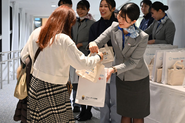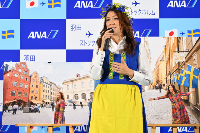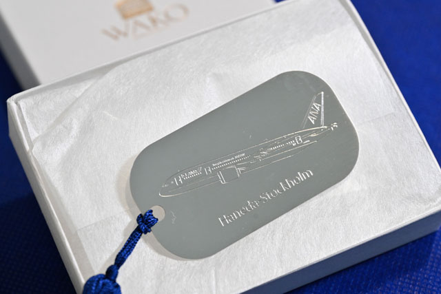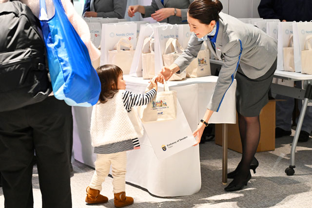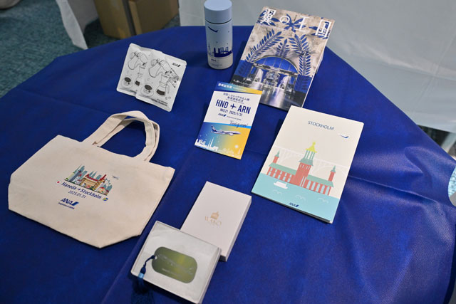 31日に羽田で開かれた就航式典には、ヴィクトリア・リー駐日スウェーデン大使や、スウェーデン出身のタレント、LiLiCoさん、ANAの社員アスリートでスウェーデンの女子ホッケートップリーグのチーム、リンシェーピングホッケークラブ所属の床泰留可(とこ・はるか)選手らが出席。直行便就航を祝った。乗客へ手渡された記念品は、オリジナルのステンレスボトルや銀座・和光が手掛けたしおり、コーヒーパック、ノート、搭乗証明書、スウェーデンの陶芸作家リサ・ラーソンの陶器オブジェがモデルのキーホルダー、FIFA FABRIKENの焼き菓子などが用意された。