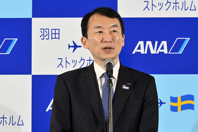 搭乗口付近で開かれた就航記念式典で、ANAの平澤寿一専務は「2020年に就航する予定だったが、約5年お待ちいただいた。ストックホルムはANAにとって初めての北欧路線。日本各地からストックホルムへ出掛けられるダイヤ設定で、スウェーデンから日本を訪れる人が増えており、日本各地へ足を運んでもらいたい」とあいさつした。