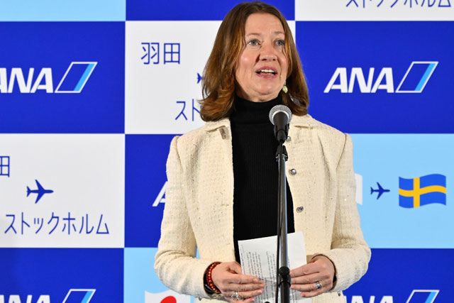 羽田空港第2ターミナル国際線施設で開かれた羽田-ストックホルム線就航式典で挨拶するヴィクトリア・リー駐日スウェーデン大使=25年1月31日 PHOTO: Tadayuki YOSHIKAWA/Aviation Wire