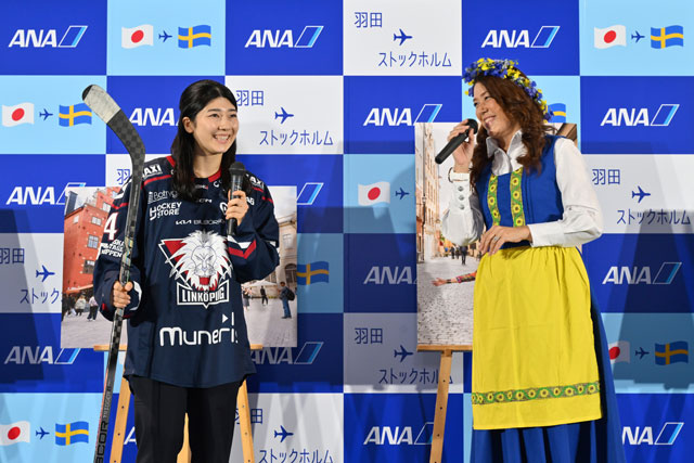 羽田空港第2ターミナル国際線施設で開かれた羽田-ストックホルム線就航式典でスウェーデンの魅力を語るLiLiCoさん(右)とANA社員アスリートの床泰留可選手=25年1月31日 PHOTO: Tadayuki YOSHIKAWA/Aviation Wire