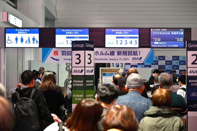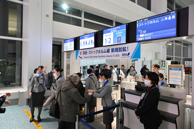 羽田空港の73番搭乗口からANAのストックホルム行き初便NH221便に搭乗する乗客=25年1月31日 PHOTO: Tadayuki YOSHIKAWA/Aviation Wire