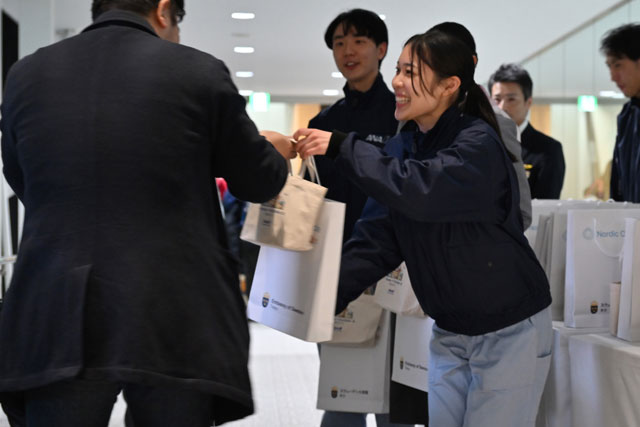 羽田空港でストックホルム行き初便NH221便の乗客に記念品を手渡すANAのグランドスタッフ=25年1月31日 PHOTO: Tadayuki YOSHIKAWA/Aviation Wire