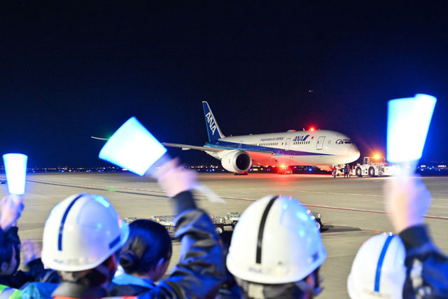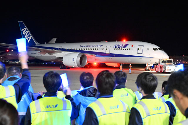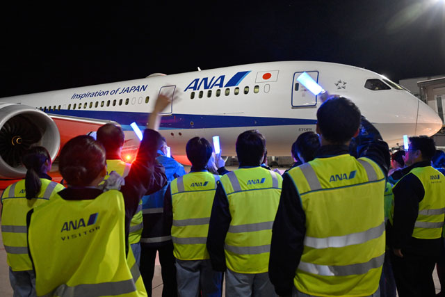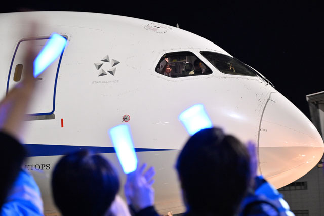 羽田空港を出発するANAのストックホルム行き初便NH221便を見送る社員ら=25年1月31日 PHOTO: Tadayuki YOSHIKAWA/Aviation Wire