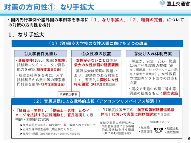 国土交通省航空局(JCAB)は、女性パイロットと整備士の比率を向上させるための施策を進める。日本の女性パイロットの比率は1.9%と世界平均の4.7%を大きく下回っており、国の航空大学校(航大)では、158センチ以上としている身長要件が女性参入の障壁の一つとされてきた。国交省はこれらの要件を撤廃し、新たに女性枠を暫定導入することで、10年後に女性比率10%を目指す。一方、現役パイロットの中には、性別以前に適性や能力で判断すべきとの声もある。