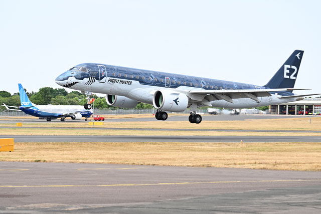 ファンボロー航空ショーで飛行展示を終えて着陸するE190-E2=22年7月 PHOTO: Tadayuki YOSHIKAWA/Aviation Wire