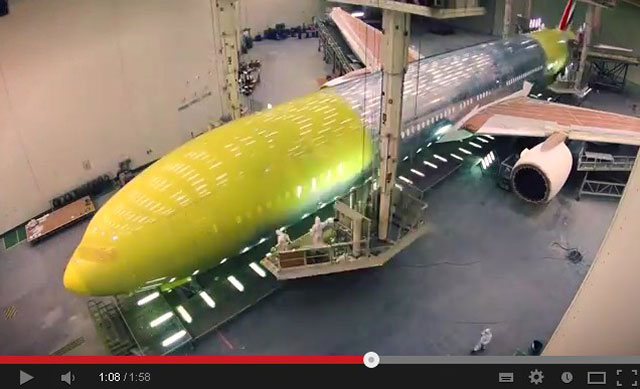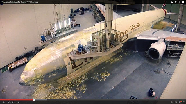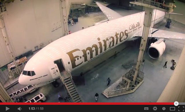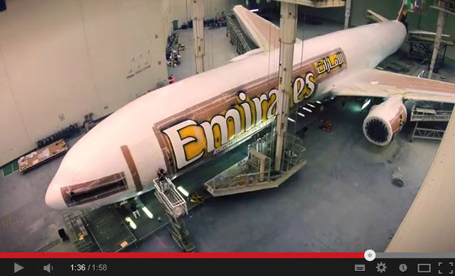 再塗装作業が進むエミレーツの777(ユーチューブの同社動画から)