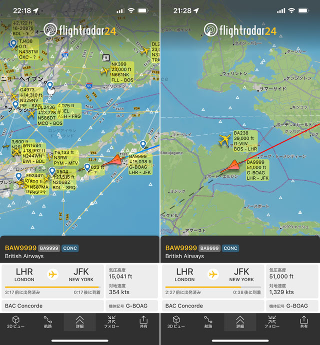 フライトレーダー24に現れたコンコルドによるヒースロー発JFK行きBA9999便。ボストン発ヒースロー行きBA238便とすれ違う場面も(右)