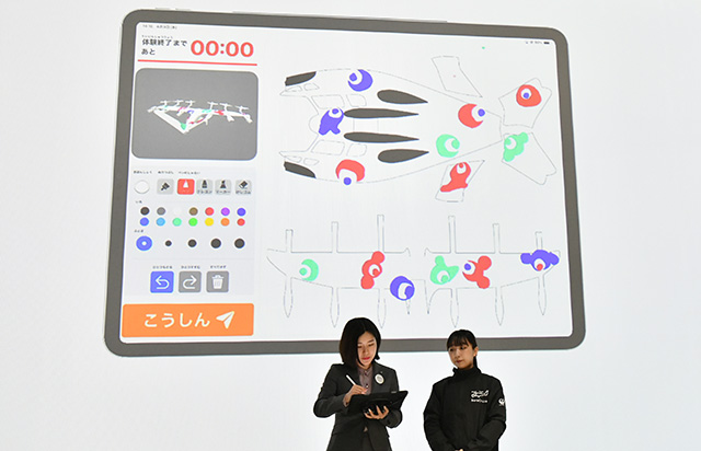 イマーシブシアター「そらクルーズ」でデジタルお絵かきを披露するJALのスタッフ=25年4月9日 PHOTO: Yusuke KOHASE/Aviation Wire