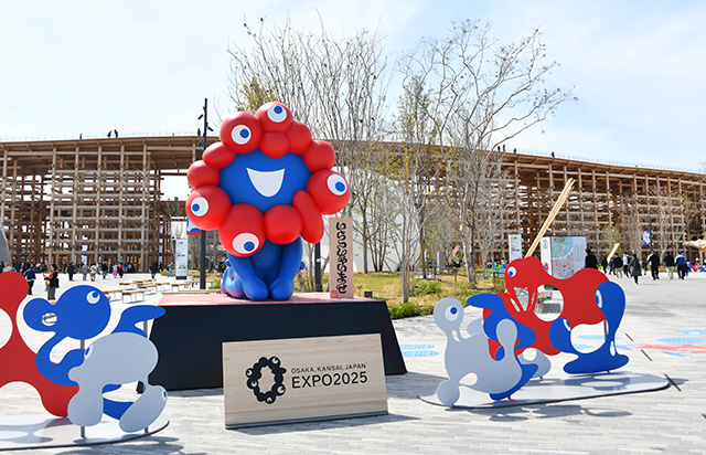 大阪・関西万博会場の東ゲート付近で来場客を出迎えるミャクミャク=25年4月9日 PHOTO: Yusuke KOHASE/Aviation Wire