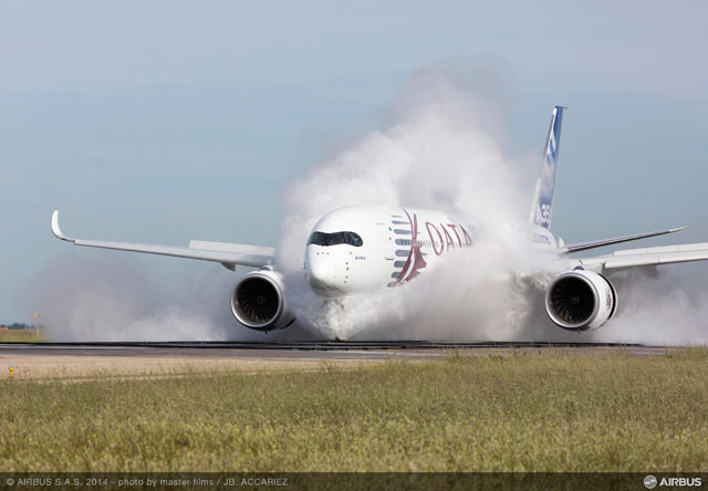 エアバスは現地時間5月9日、A350 XWBの試験機(MSN4)を用いて、水たまりのある滑走路での認証試験を実施し、成功したと発表した。