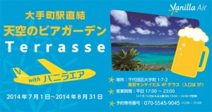 バニラエア(VNL/JW)は7月1日から、東京・大手町にビアガーデンをオープンする。8月31日までの期間限定で、飲食店事業を展開するサンケイ会館との共同事業。