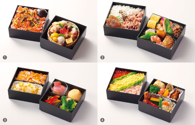 9月から提供を開始する料理の一例。(1)羽田発「馳走 啐啄」、(2)伊丹発「日本料理 かが万」、(3)札幌発「料理屋 素」、(4)福岡発「博多十和蔵」(ANA提供)