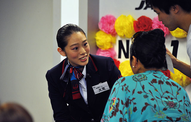 日本航空(JAL/JL、9201)は9月2日、成田空港に勤務するグランドスタッフ(GS、地上係員)を対象にした「N-1(NaritaのNo.1)グランプリ2014」を空港内の成田オペレーションセンターで開催した。サービス部門のスタッフ9人が参加。アナウンス技術や接客技術を競った。