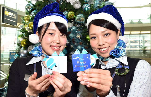 ANAでは2012年から毎年、23日から25日までのクリスマス期間中、羽田のカウンター付近で青いコートに身を包んだ地上係員が出発客を出迎えていたが、今年は帽子のみ着用となった。