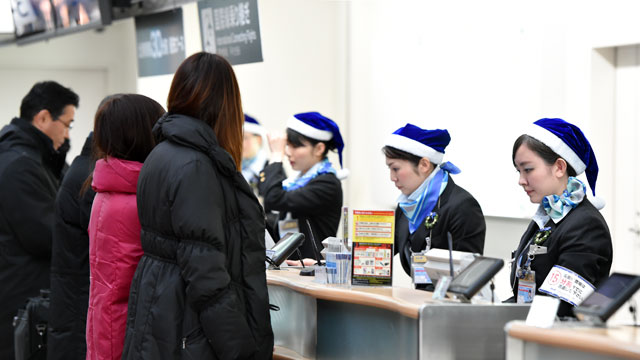 羽田空港にある全日本空輸(ANA/NH)のカウンターでは、12月25日まで空港係員たちが青いサンタクロースの帽子をかぶって乗客を出迎えている。
