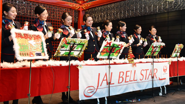 羽田国際線ターミナルでミュージックベルを披露するJALベルスター=12月23日 PHOTO: Tadayuki YOSHIKAWA/Aviation Wire