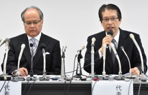 2月からの運休便を説明するスカイマークの有森社長(右)と井手会長=1月29日 PHOTO: Tadayuki YOSHIKAWA/Aviation Wire