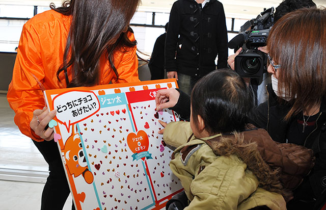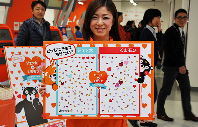 バレンタインデーを4日後にひかえた2月10日、ジェットスター・ジャパン(JJP/GK)は成田空港の同社チェックインカウンター前で、バレンタインイベントを実施した。JJPのキャラクター「ジェッ太」のほか、同社が就航する熊本から県の人気キャラクター「くまモン」も参加。どちらにチョコを渡したいか、人気投票を実施した。シールを多く集めるのはどっち──?
