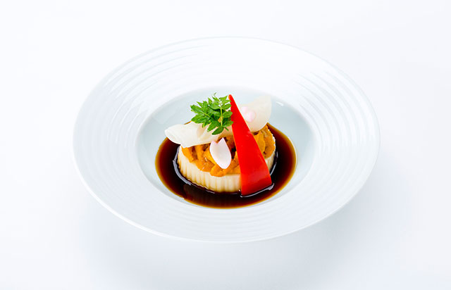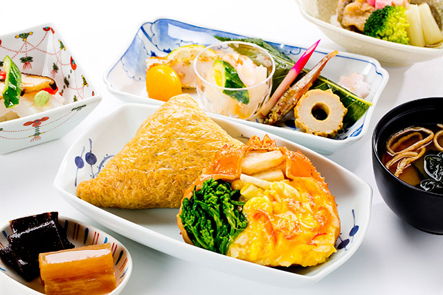 国際線ビジネスクラスでは、鳥取をテーマにした「郷土料理 鳥取」を提供。カニの身にカニミソを加え玉子でとじた「紅ずわい蟹甲羅焼き」に、大きな油揚げに米と野菜を詰めてダシで炊きあげた、県西部・弓ヶ浜半島の名物料理「いただき」を添えた。
