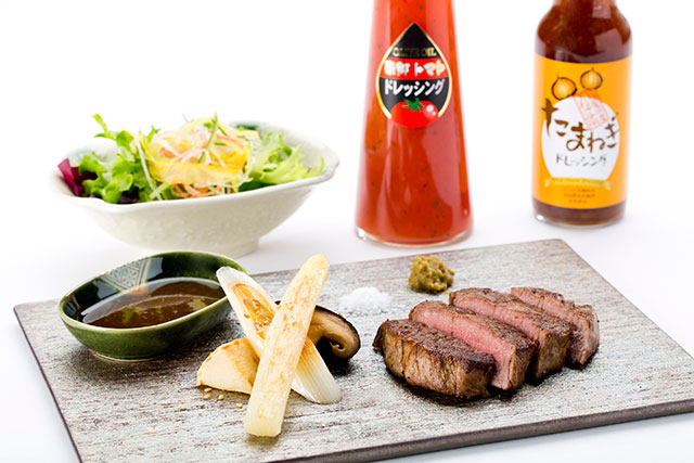 羽田国際線ラウンジ内「DINING h」では、大阪・貝塚名産「木積たけのこ」を使用したステーキや、福島県産黒毛和牛のフィレ肉を使用したステーキセットを用意。タケノコは4月、牛ステーキは5月に提供する。