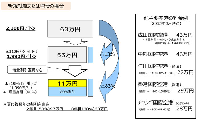 割引制度では、国際線着陸料を1トン当たり310円値下げし、1990円としている。航空会社が新規就航や増便する際、初年度80%、2年目50%、3年目30%の割引率を適用しており、深夜早朝となる午前1時から午前5時59分に着陸する場合は、50%割り引いている。