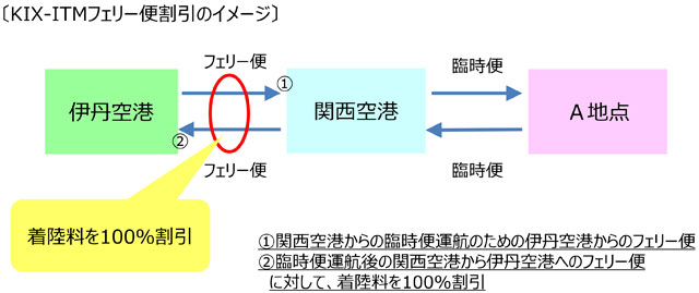 2015年度は新たに、関空と伊丹空港間のフェリーフライト(回送)について、着陸料を無料にする。関空から臨時便を運航するための回送と、臨時便運航後に伊丹へ機材を戻す際に適用する。