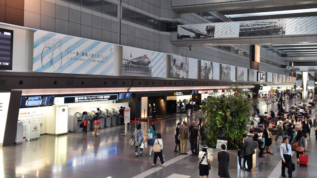 開館60周年を記念し第1ターミナルの出発ロビー壁面に飾られた写真=5月21日 PHOTO: Tadayuki YOSHIKAWA/Aviation Wire