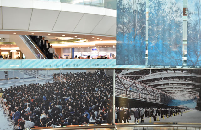 第1ターミナルのエスカレーター脇では、開館からの歩みを時系列に展示。出発ロビーの壁面には、屋上で実施していた羽田節(はねだぶし)の「盆踊り」や、窓を隔てて出発する人と残る人が別れを惜しむ「別れの窓」など、幅15メートル以上の大型写真を掲示している。