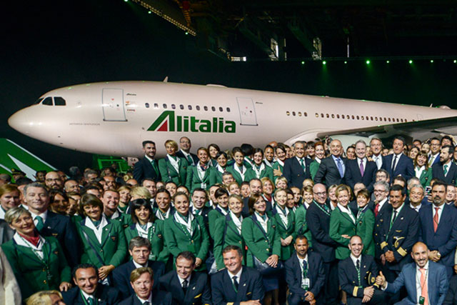 新デザインを採用したA330を囲むアリタリアの社員(同社提供)