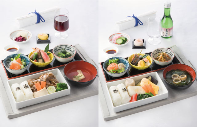 日本路線では別メニューの提供も予定している。前菜には牛肉照り焼きやニシンの昆布巻きなど、主菜には塩焼きと黄金焼きのタイ2色焼きを用意する。提供開始日は未定。